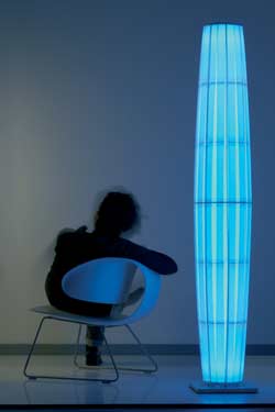Le lampadaire à Leds RVB/RGB de la collection Colonne est équipé d'ampoules trichromatique contrôlées par une télécommande à fonctions multiples. Cette commande permet de régler son éclairage de 7 teintes différentes ou de varier en boucle les couleurs. Le tissu plissé non illuminé est blanc.La colonne est posée sur un socle carré en inox brossé. Colonne existe en suspensions de 4 tailles différentes, en lampadaire et en lampe à poser. Designer: Fabrice Berrux