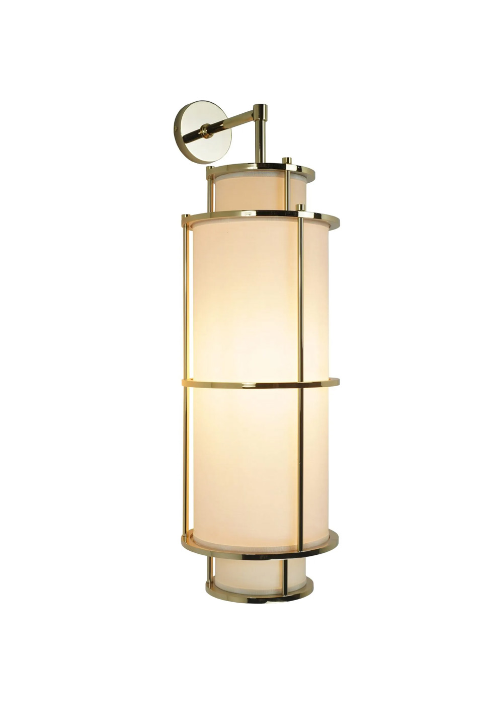 Elégante applique art déco Annie en un format cylindrique de chintz ivoire et structure en métal finition or clair. Cette structure est faite d'un assemblage de cerclages reliées par de fines tiges verticales, le tout en métal avec une impeccable finition dorée. A l'intérieur de la structure est glissé le diffuseur, composé de 3 parties, une principales en large cylindre, et deux petits cylindres placés de part et d'autre des extrémités du diffuseur principal. L'applique est fixée au mur grâce à un très court bras en angle droit et d'un support mural rond, tous deux en métal doré. C'est un modèle qui fera son plus bel effet dans une ambiance feutrée et intimiste, comme vous pouvez le voir sur les photos secondaires.