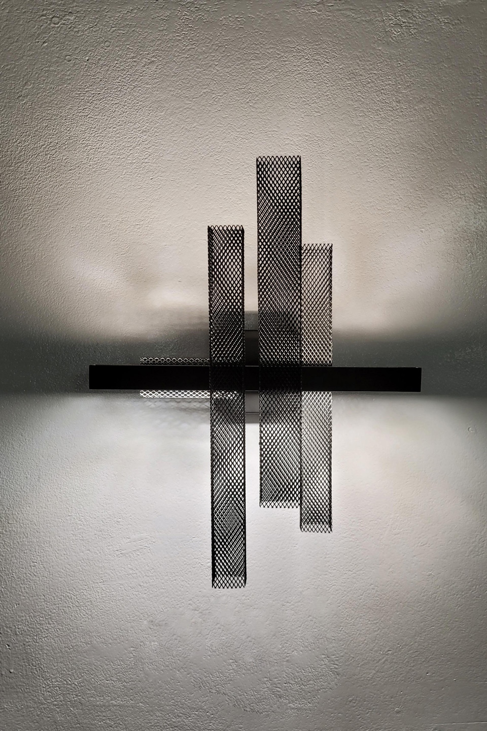 Par son dessin graphique et son éclairage haut et bas, l'applique Metropolis noire mate à éclairage LED intégré anime un mur avec élégance. Cette applique se compose de trois tubes carrés de tailles différentes en résille métallique peinte à la main, assemblés selon un dessin précis qui structure visuellement le mur. La composition évoque une Skyline urbaine stylisée, avec un jeu de pleins et de vides qui laisse circuler la lumière tout en affirmant une présence sculpturale marquée. L'éclairage LED puissant et de grande qualité diffuse la lumière vers le haut et vers le bas, créant un éclairage indirect qui met en valeur les surfaces. De faible profondeur, l'applique Metropolis trouve naturellement sa place dans un couloir, un espace de circulation ou en éclairage d'accent sur un mur.