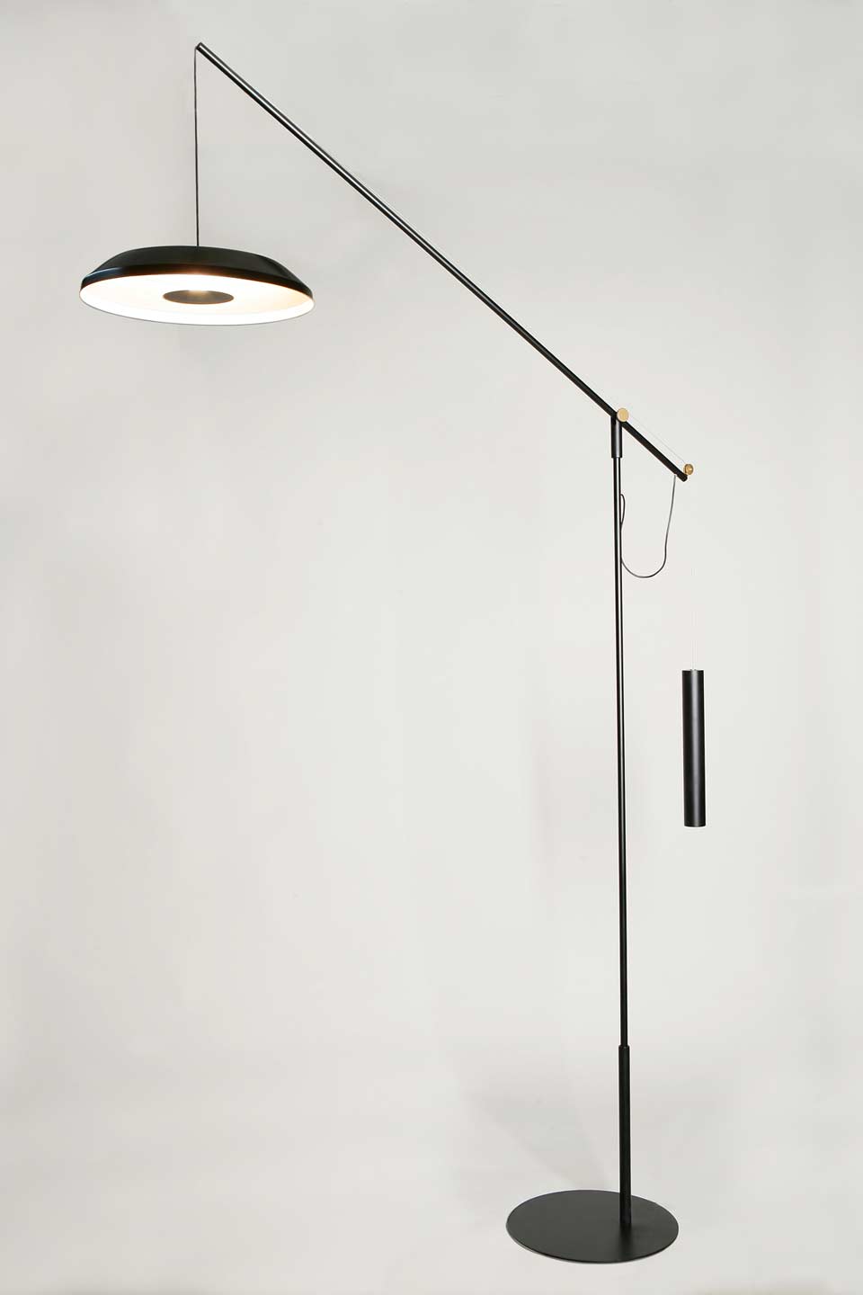 Lampadaire déporté à contrepoids articulé intégralement noir, Momento offre un jeu d'équilibre précis entre bras tendu, cylindre lesté et dôme métallique abritant un éclairage LED intégré puissant. Le pied en acier noir mat tourne sur son axe depuis le socle circulaire jusqu'à la tête lumineuse, tandis que l'articulation permet de régler avec précision la hauteur de l'abat-jour. Le dôme noir intérieur blanc diffuse un éclairage indirect, idéal pour un coin lecture, un salon ou un espace de travail. Quelques détails dorés viennent souligner l'articulation.