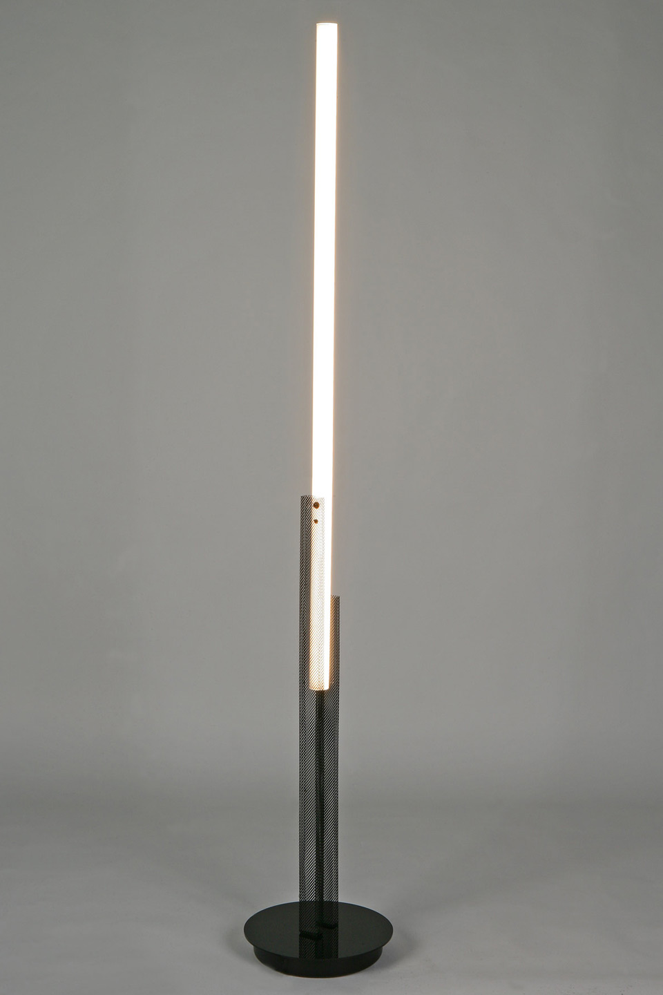 Le lampadaire minimaliste et contemporain Hikari en maille métallique noire, avec diffuseur en tube vertical et éclairage LED intégré, propose un modèle à la lecture rigoureuse et géométrique. Le luminaire repose sur un socle rond surélevé en métal noir, stable et discret, sur lequel sont implantés deux tubes rectangulaires en résille métallique noire. Dans la continuité directe de ces tubes, le diffuseur forme un long tube vertical doté d'un éclairage LED puissant et de grande qualité, conçu comme un seul trait lumineux. La lumière est diffuse et homogène, a placer près d'un canapé, dans un angle de pièce ou le long d'un mur. L'association du socle circulaire, de la maille métallique noire et du diffuseur blanc assure une lecture claire du dessin et une cohérence formelle d'ensemble.