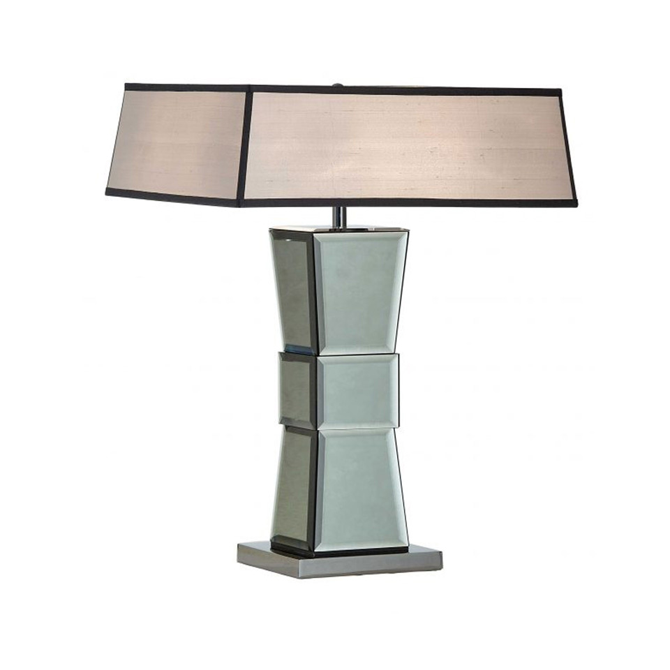 La sculpturale lampe de table Marlene est une superbe combinaison d'un pied en bois plaqué de miroir fumé aux angles biseautés et abat-jour de section carrée à liseré noir, un design géométrique avec une inspiration Art Déco. Le modèle est doté d'un socle carré en métal, sur lequel s'érige le pied de la lampe, un pilier légèrement incurvé fait de 3 blocs de métal géométriques empilés. L'ensemble est soigneusement complété par un large abat-jour de section carrée en tissu beige bordé d'un liseré noir. Une plaque de métal nickel noir coiffe l'ensemble et masque les ampoules. La douceur de la lumière garantie par la délicatesse de l'abat-jour en fait une parfaite acquisition pour un chambre a coucher, pour encadrer un lit et créer une ambiance feutrée.