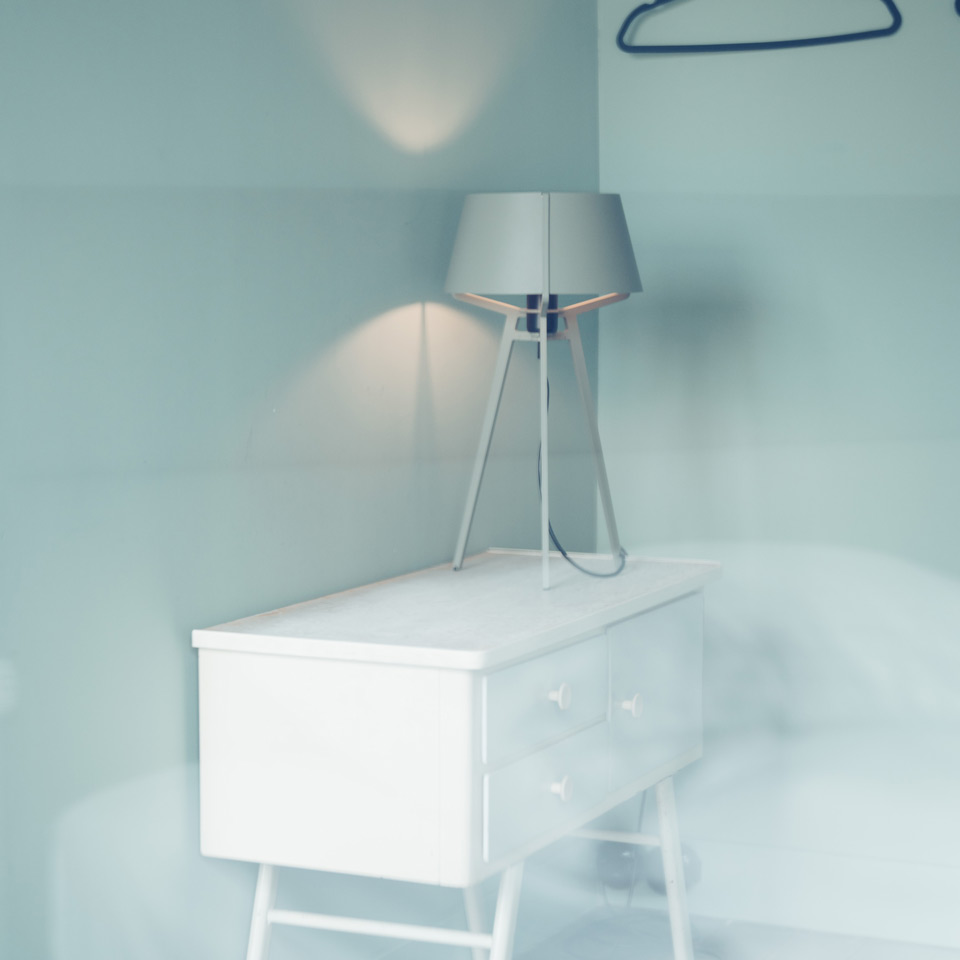 Une finition bleu glacier sur un trépied en métal avec variateur intégré : la lampe Bella . Elle repose sur trois pieds en acier soutenant un abat jour en aluminium légèrement conique. La douille dorée en laiton diffuse une lumière modulable grâce au variateur fixé sur un long cordon d'alimentation noir.
