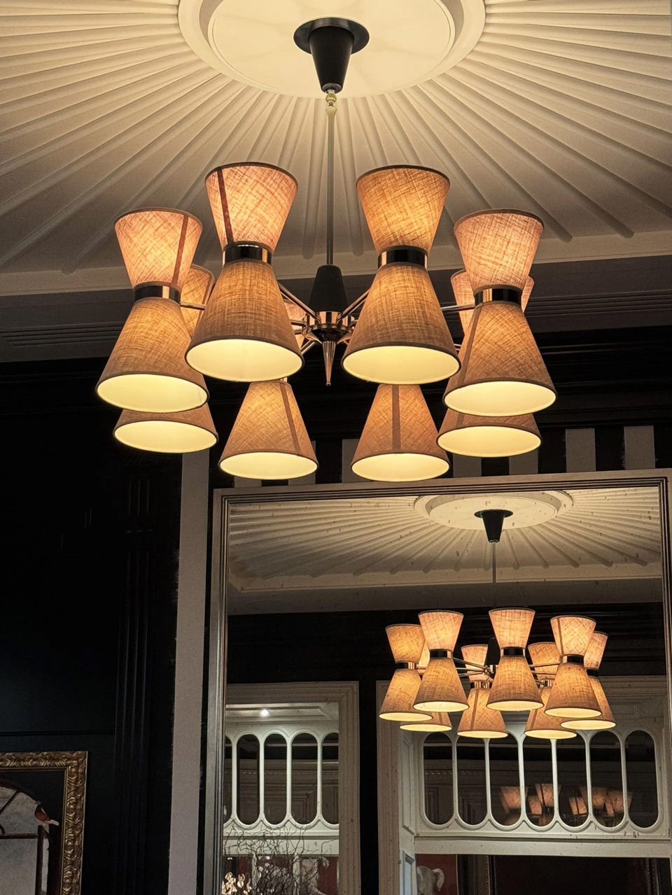 Le lustre Divina à 5 lumières séduit par son design raffiné, associant des abat-jours en lin naturel en forme de sablier à une structure en métal chromé. Cinq bras en tubes métalliques courts s'étendent en étoile autour d'un fût central, chacun supportant un abat-jour à son extrémité. Chaque abat-jour accueille 2 ampoules, une dirigée vers le bas et une autre dirigée vers le haut. Cette disposition assure un éclairage homogène tout en mettant en valeur le contraste entre la texture du lin et l'éclat du chrome, qui sublime l'ensemble, créant une atmosphère lumineuse et raffinée. Son esthétique épurée s'intègre aussi bien dans un intérieur classique que contemporain.