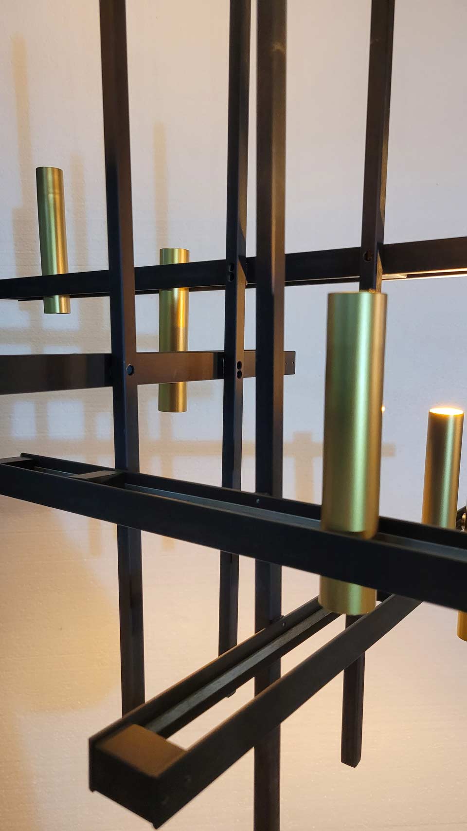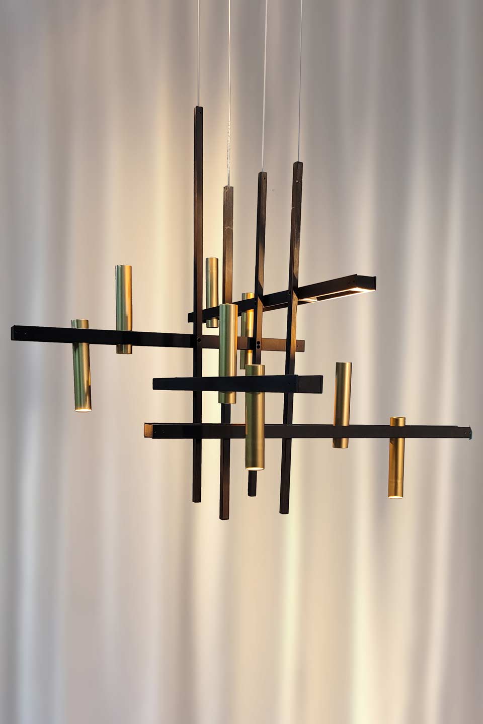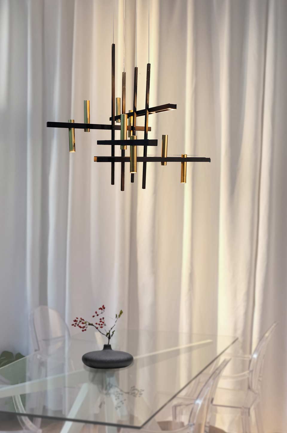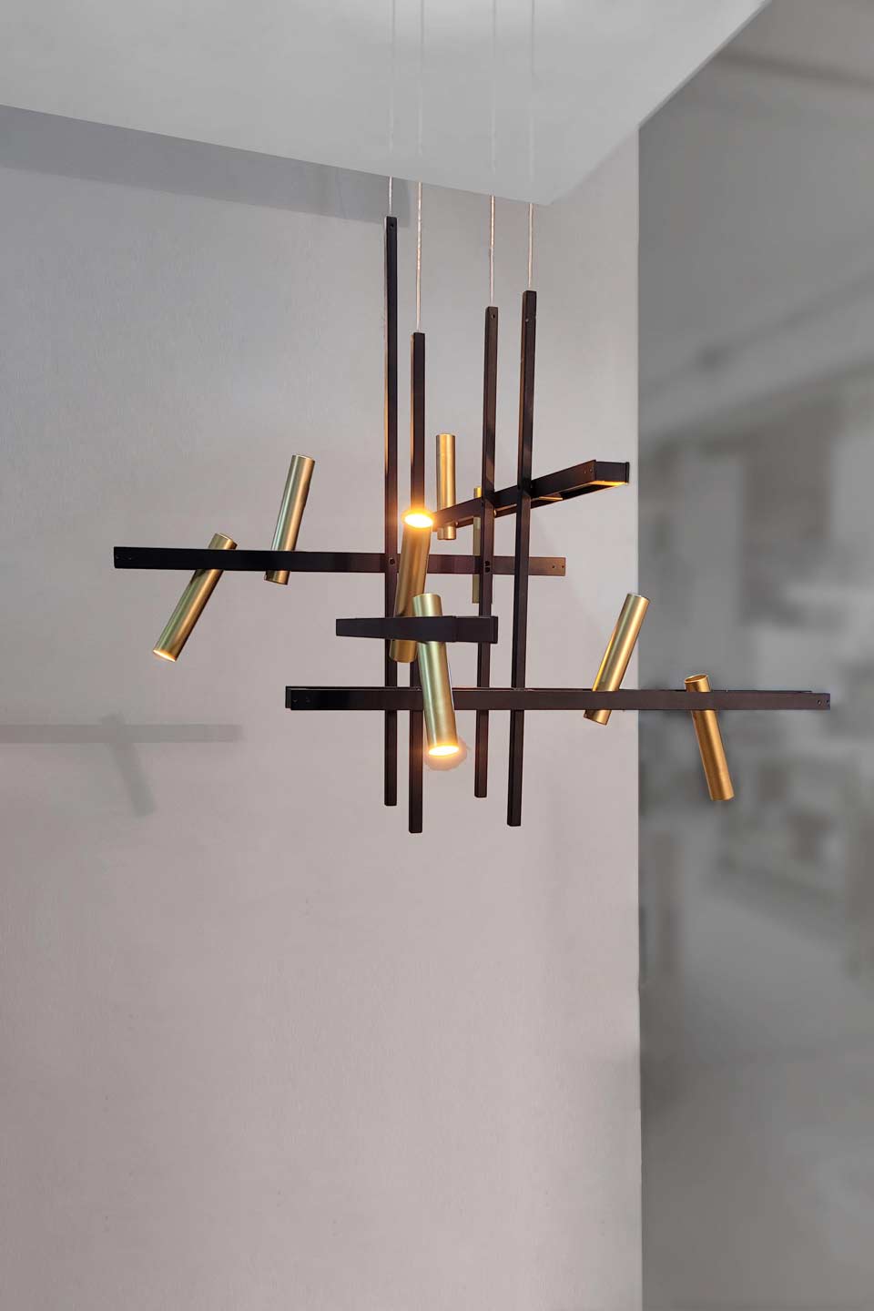 La suspension graphique contemporaine Akrobat associe une structure en métal noir et des spots cylindriques en laiton doré avec éclairage LED intégré pour un éclairage architectural précis et puissant. Pensée comme une composition en équilibre, cette suspension joue sur l'assemblage de sections carrées en métal noir qui se croisent et se superposent, créant un volume aérien. Les cylindres en laiton accueillent un éclairage LED intégré performant, offrant une lumière directionnelle idéale au-dessus d'une table, d'un îlot ou dans un espace de réception. Les spots orientables dirigés vers le haut ou vers le bas permettent de moduler les faisceaux lumineux et d'accentuer certaines zones, tandis que le contraste entre le noir mat et le doré affirme une esthétique contemporaine forte et sophistiquée.