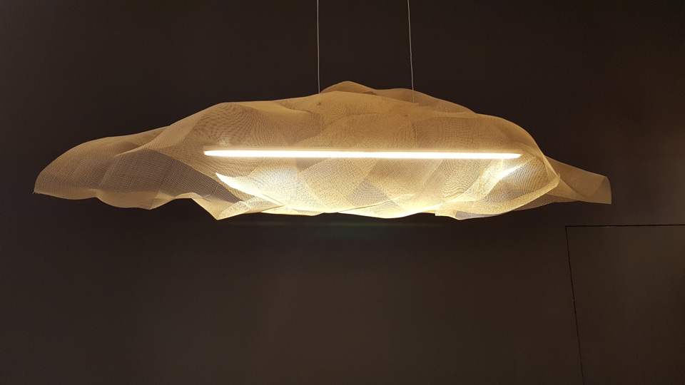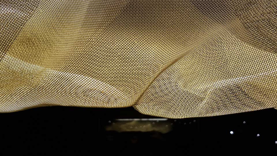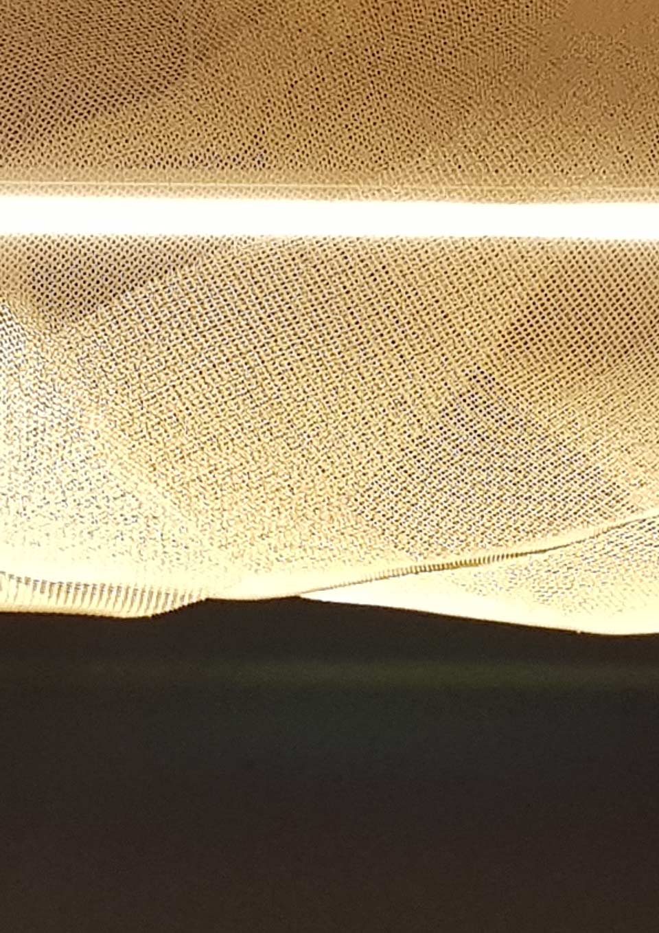 Un voile en acier doré, suspension à éclairage LED intégré, la suspension Aura se distingue par un dessin léger, suspendu dans l'espace comme une surface flottante. Le luminaire est composé d'un voile en acier doré finement perforé, légèrement ondulé, qui enveloppe une ligne lumineuse horizontale intégrant l'éclairage LED. Cette structure souple et aérienne filtre la lumière et crée un éclairage doux, à la fois vers le bas et à travers la matière métallique. La suspension est maintenue par deux câbles reliés à un support de plafondrond en métal doré. Le contraste entre la ligne LED et le voile métallique aux contours irréguliers crée une tension visuelle maîtrisée, où la lumière structure la forme sans rigidité.