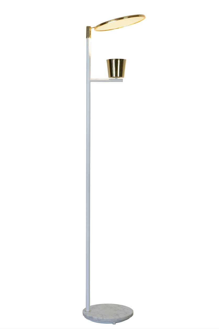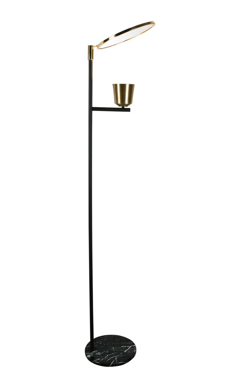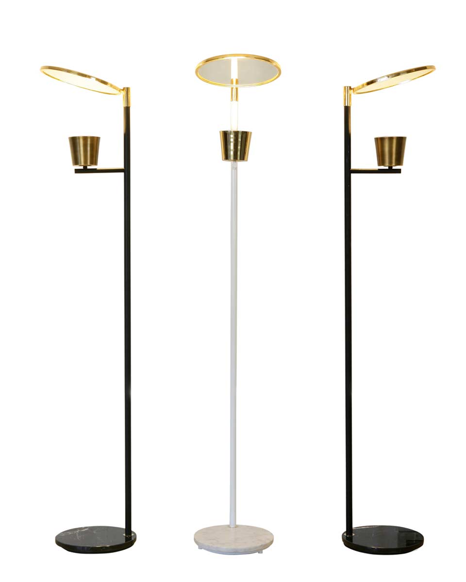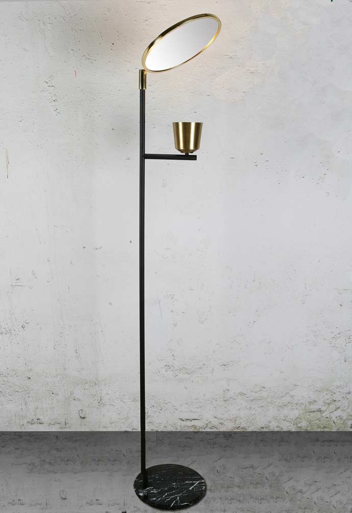Lampadaire à éclairage LED indirect noir avec miroir, Lupa reprend les codes du design italien des années 50 dans une écriture à la fois fonctionnelle et élégante. Sa structure fine en acier noir mat repose sur un socle en marbre de Carrare et supporte un miroir circulaire en laiton poli, conçu pour réfléchir la lumière et la diffuser sans éblouissement. Le miroir pivotant à 360° permet d'orienter précisément l'éclairage selon l'espace, tandis que le diffuseur marque le module LED. Les contrastes entre noir mat, laiton et marbre renforcent l'équilibre visuel de l'ensemble. Pensé comme un lampadaire sculptural autant que fonctionnel, Lupa s'intègre naturellement dans un salon, un coin lecture ou un intérieur recherchant un éclairage puissant.