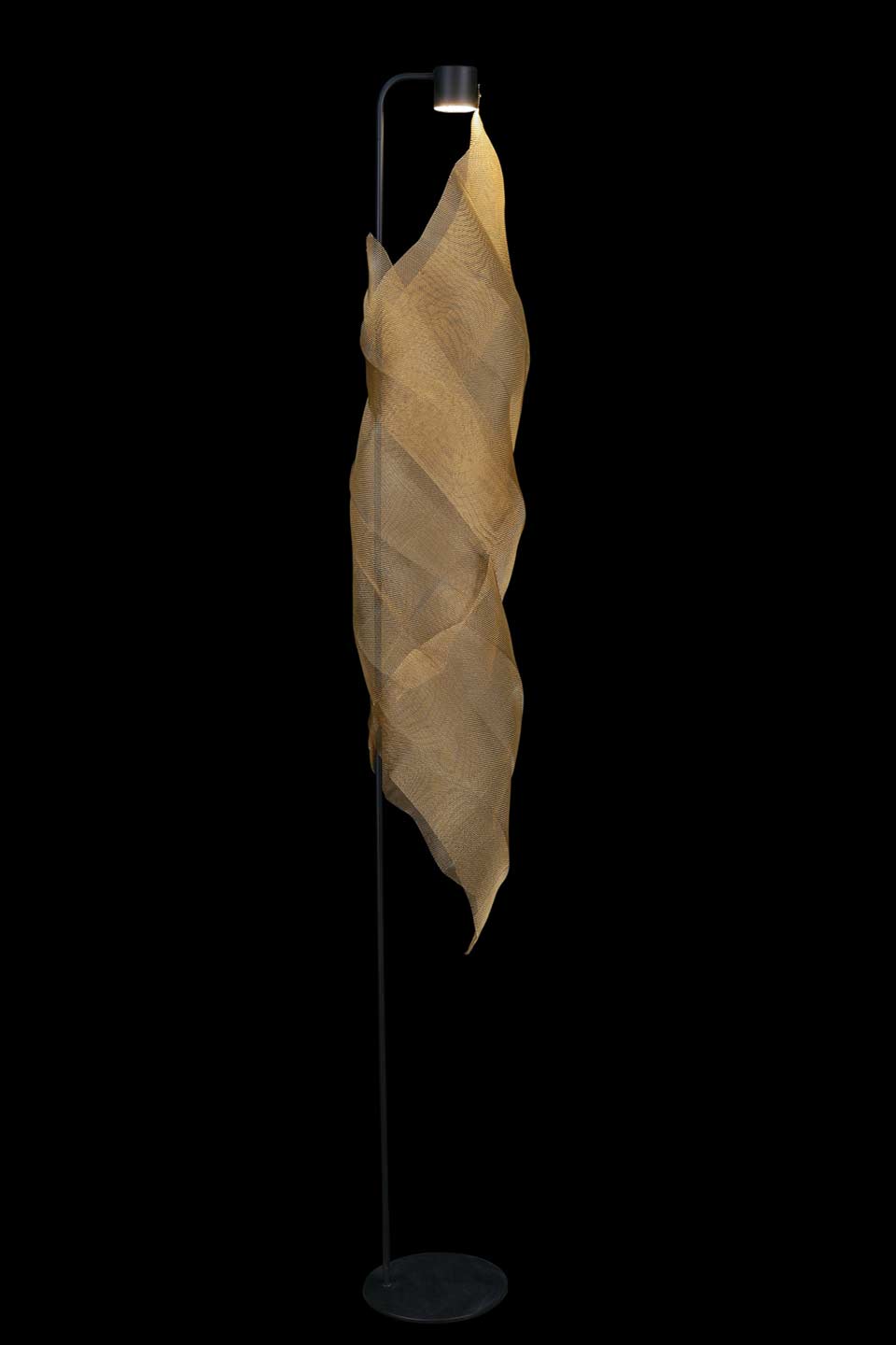 Lampadaire contemporain à voile métallique et éclairage LED intégré, le modèle Aura transpose le principe de la collection dans une version sur pied, pensée comme une présence verticale légère et maîtrisée. Le lampadaire repose sur un socle rond en métal noir, fin et stable, depuis lequel s'élève un mât discret en métal noir qui supporte la source lumineuse. Sous la tête de lampe, un voile métallique souple est suspendu et déployé verticalement, formant une surface ondulée aux plis irréguliers rappelant du tissu. L'éclairage LED intégré est dirigé vers le bas et traverse partiellement la matière, produisant une lumière filtrée qui se diffuse le long du voile et sur l'espace immédiat. Le contraste entre la structure rigoureuse du pied, la précision de la source lumineuse et la fluidité du voile métallique donne au lampadaire Aura une lecture claire et équilibrée. Il est adapté à un éclairage d'appoint, placé près d'un canapé, dans un angle de pièce ou en ponctuation lumineuse le long d'un mur, où la lumière accompagne l'espace sans le saturer.