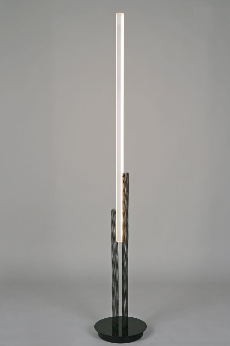 Le lampadaire minimaliste et contemporain Hikari en maille métallique noire, avec diffuseur en tube vertical et éclairage LED intégré, propose un modèle à la lecture rigoureuse et géométrique. Le luminaire repose sur un socle rond surélevé en métal noir, stable et discret, sur lequel sont implantés deux tubes rectangulaires en résille métallique noire. Dans la continuité directe de ces tubes, le diffuseur forme un long tube vertical doté d'un éclairage LED puissant et de grande qualité, conçu comme un seul trait lumineux. La lumière est diffuse et homogène, a placer près d'un canapé, dans un angle de pièce ou le long d'un mur. L'association du socle circulaire, de la maille métallique noire et du diffuseur blanc assure une lecture claire du dessin et une cohérence formelle d'ensemble.