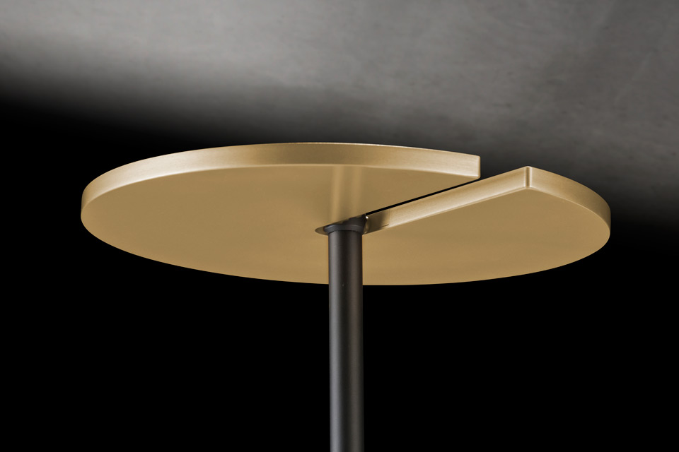 The minimalist elegance of this black and gold Naxos floor lamp lies in its simple design: a slender metal silhouette with an adjustable head and powerful, high-quality integrated LED lighting. The Naxos features a round base and a straight stem, both crafted from matt black metal. The disc-shaped lamp head with a beautiful matt brass finish catches the eye. It is made from anodised aluminium, which gives it the appearance of matt brass while retaining the technical advantages of metal: lightness, strength and stability. Equipped with a powerful integrated LED module, the head pivots on vertical and horizontal axes, allowing the light to be perfectly adjusted. The Naxos is equipped with a black power cable and a touch-sensitive switch and dimmer located on the base.