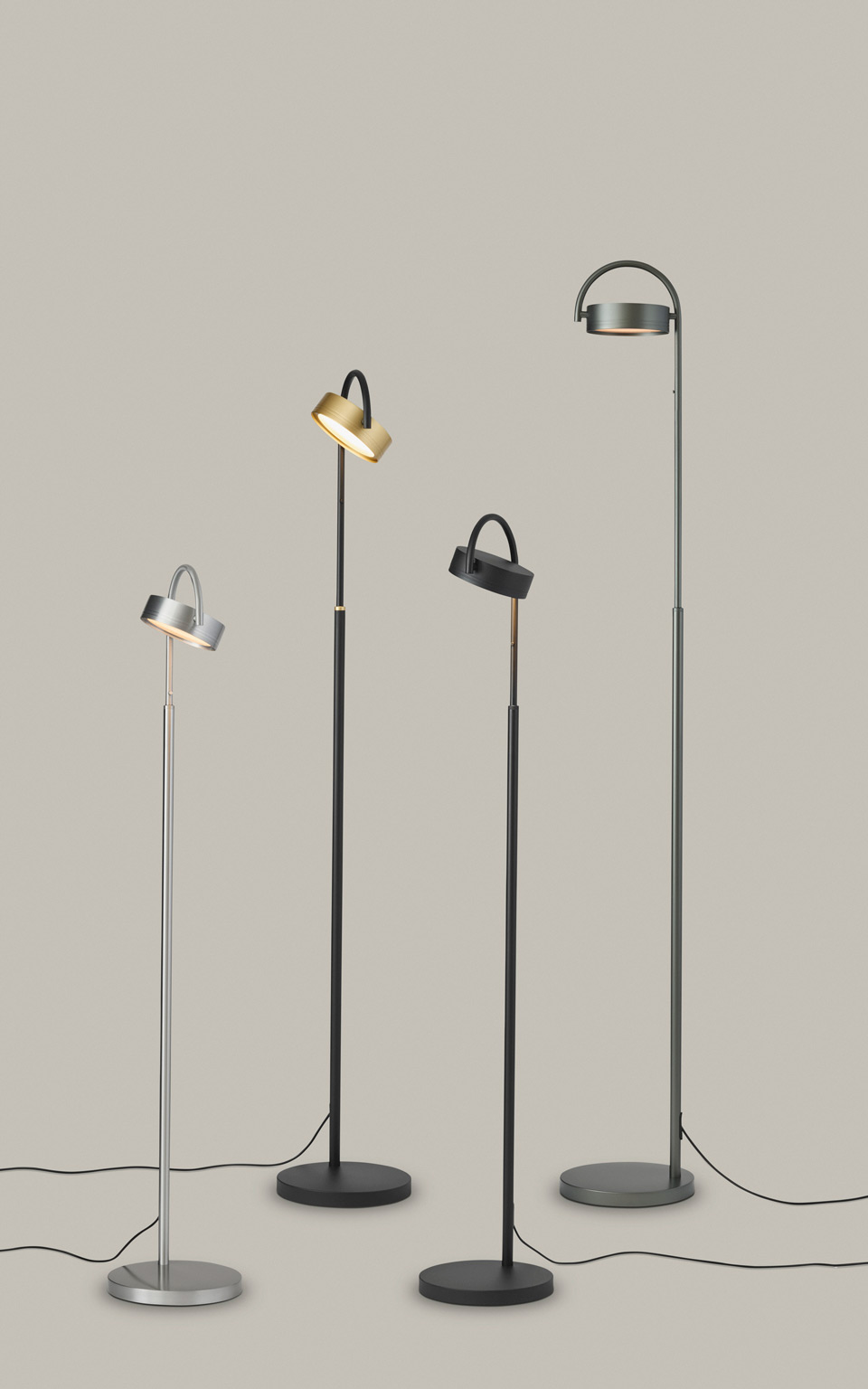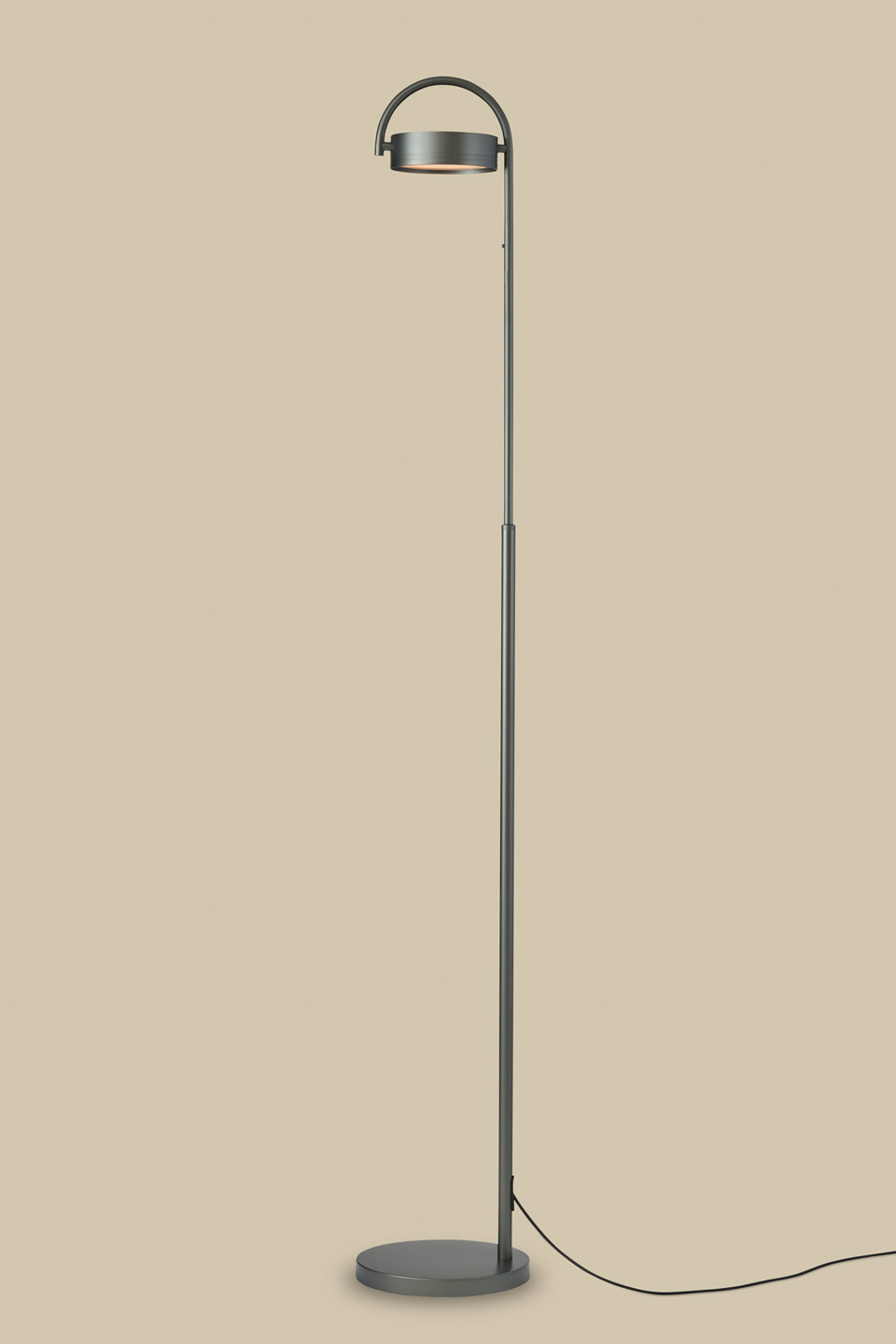 The platinum-finish metal Favor floor lamp with reading light is eye-catching, with its slender silver lines, adjustable head and integrated LED lighting. The lamp rests on a slim, circular base and is extended by a straight, height-adjustable stem with a telescopic rod. The inverted U-shaped end houses the lamp head: a thick, lightweight, stable and durable disc of platinum-finish anodised aluminium. The diffuser pivots on a vertical axis, enabling precise light direction from a powerful, high-quality LED module. A dimmer switch and touch-sensitive switch are integrated into the base. With a black power cable, this floor lamp can be used as an accent or reading light.