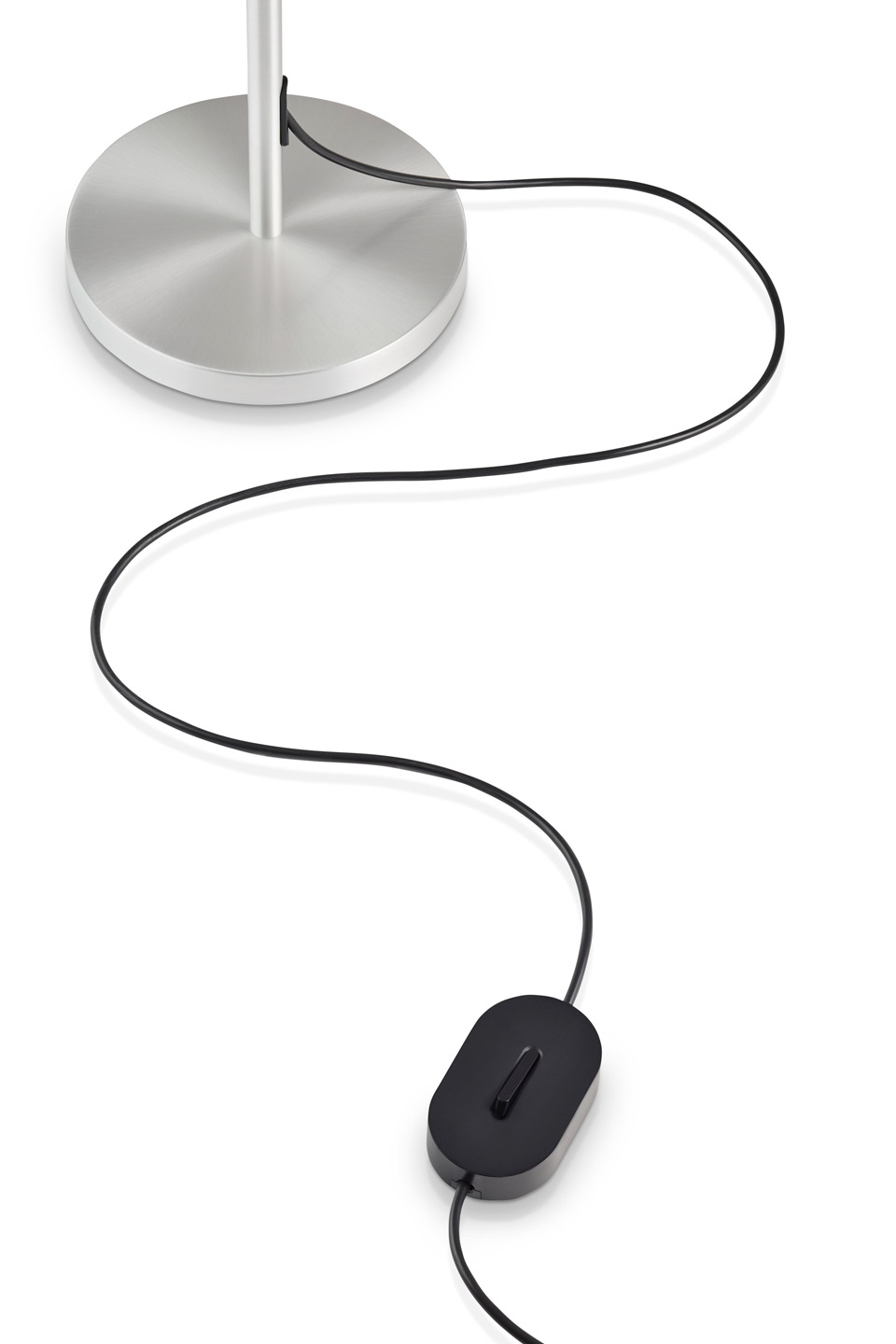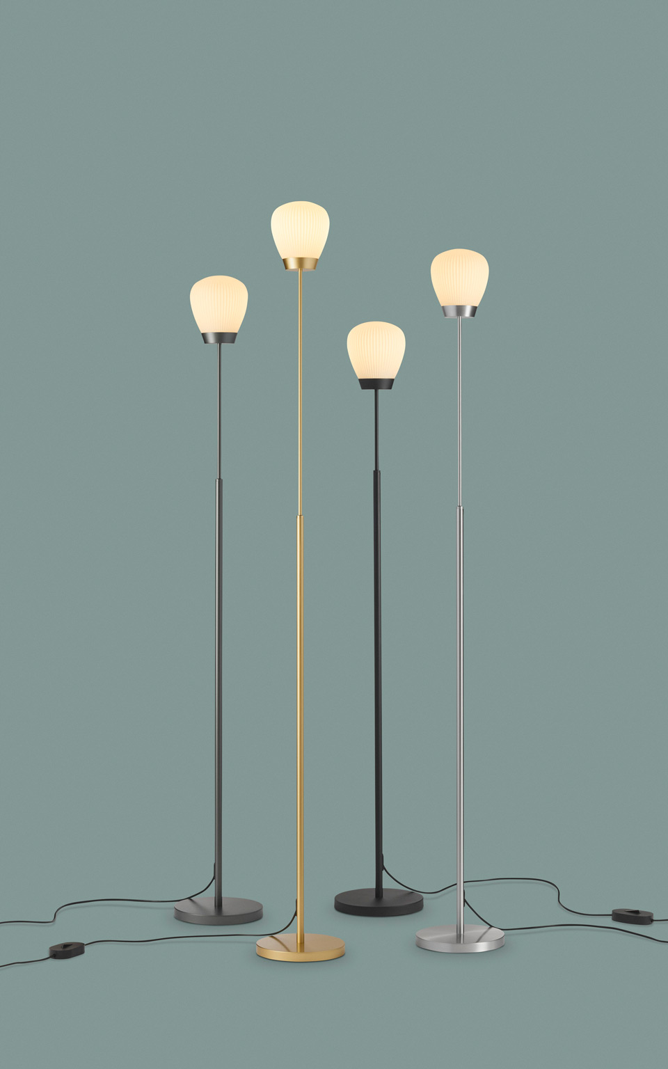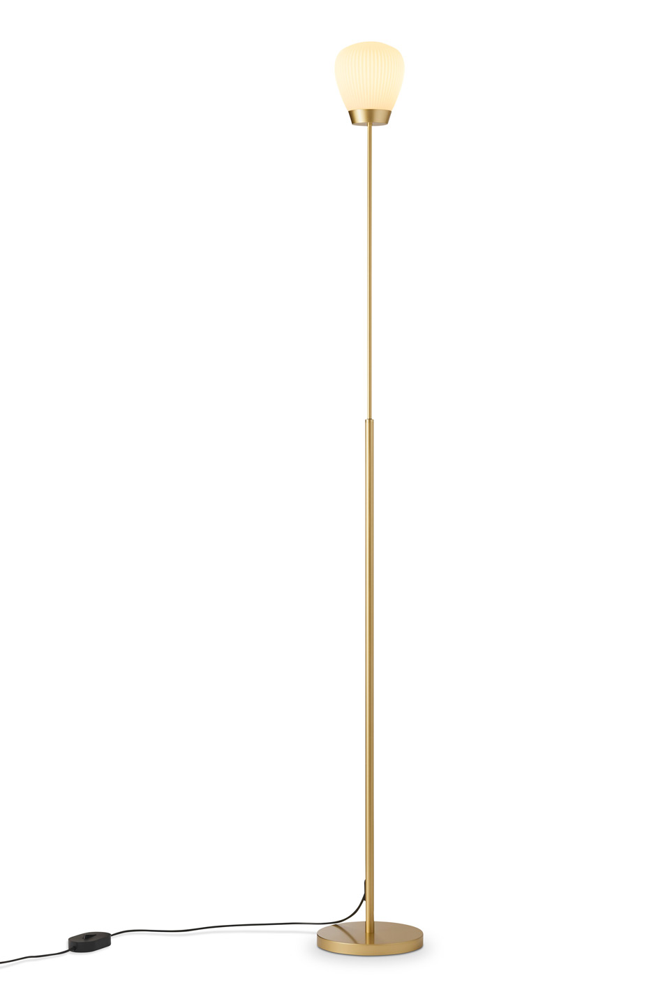 Add a retro touch to your home with the Plissée floor lamp. It features a height-adjustable aluminium base with a matt brass anodised finish and a matt white blown glass diffuser with a pleated effect. This model has a round base topped by a straight aluminium stand with a matt brass finish, which retains the technical advantages of this metal: lightness and strength. Light emanates from a hand-blown, pleated glass diffuser shaped like a hot air balloon, giving it a striated appearance. The floor lamp has a black power cable with an elegant foot switch.
