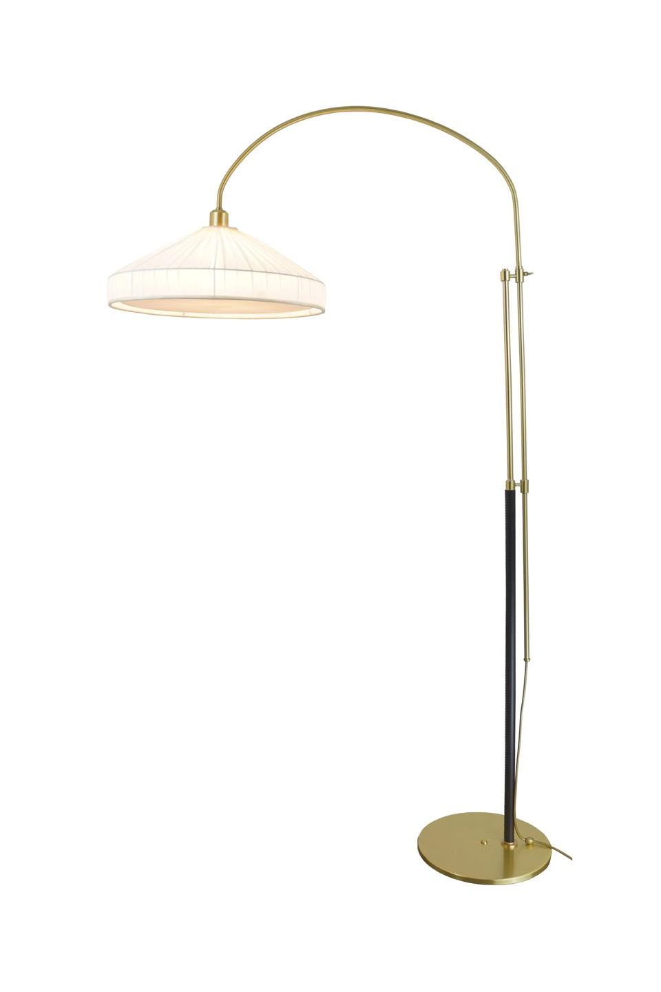 The Théa floor lamp is sure to appeal to fans of classic, functional design. It combines golden brass and leather elements with a shantung silk shade and a height-adjustable base. The floor lamp has a round, flat base, which is topped by a multi-part stem. The first section is straight and covered with a hand-stitched black leather sleeve. Attached to this is the extendable gold-plated metal section that allows the height of the floor lamp to be adjusted. The elegant, flared, conical lampshade is made of shantung silk, which comes from the Chinese province of the same name. It is recognisable by its finely ribbed texture and is decorated with a blue frieze. A plain version of the lampshade is available on request. The switch is located on the gold textile power cord.