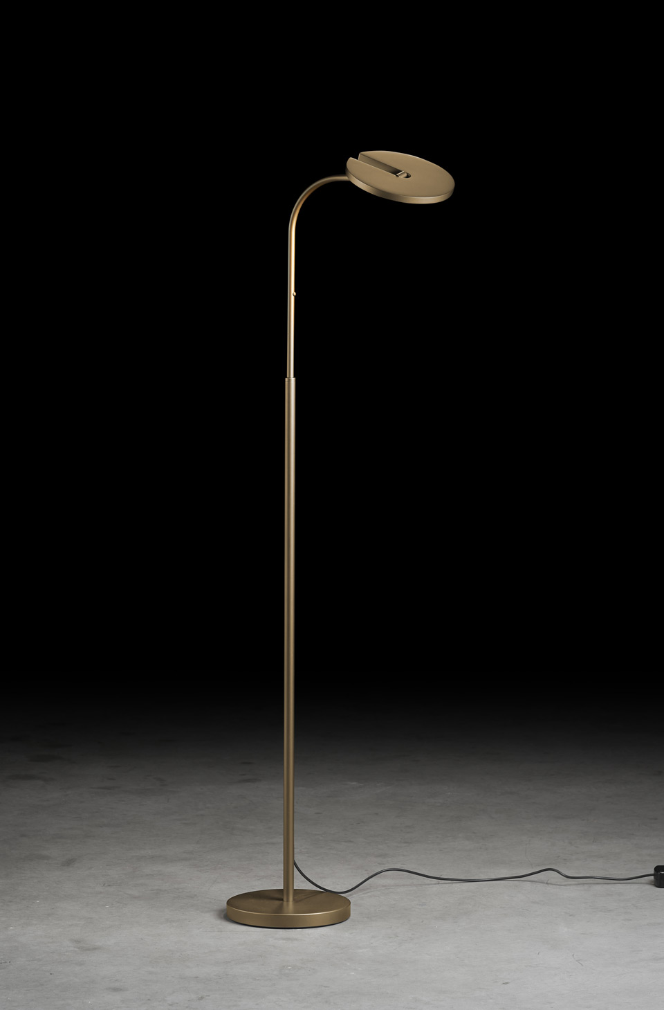 The Vince height-adjustable reading lamp with a bronze finish combines a minimalist silhouette with powerful LED lighting and an adjustable lamp head, offering a perfect balance of aesthetics and functionality. The lamp rests on a round base and is extended by a telescopic rod that can be adjusted in height. This rod incorporates a touch switch with a dim-to-warm light dimmer, meaning that the colour temperature varies with the light intensity. The base curves and extends into an ultra-minimalist lamp head shaped like a water lily. This can be adjusted on its axis and around the rod, offering great freedom of use. The matt bronze finish, with its warm reflections, adds an elegant, cosy touch. The Vince lamp is designed for use as an accent or reading light next to an armchair or in a room's corner. The floor lamp is equipped with a black power cable.