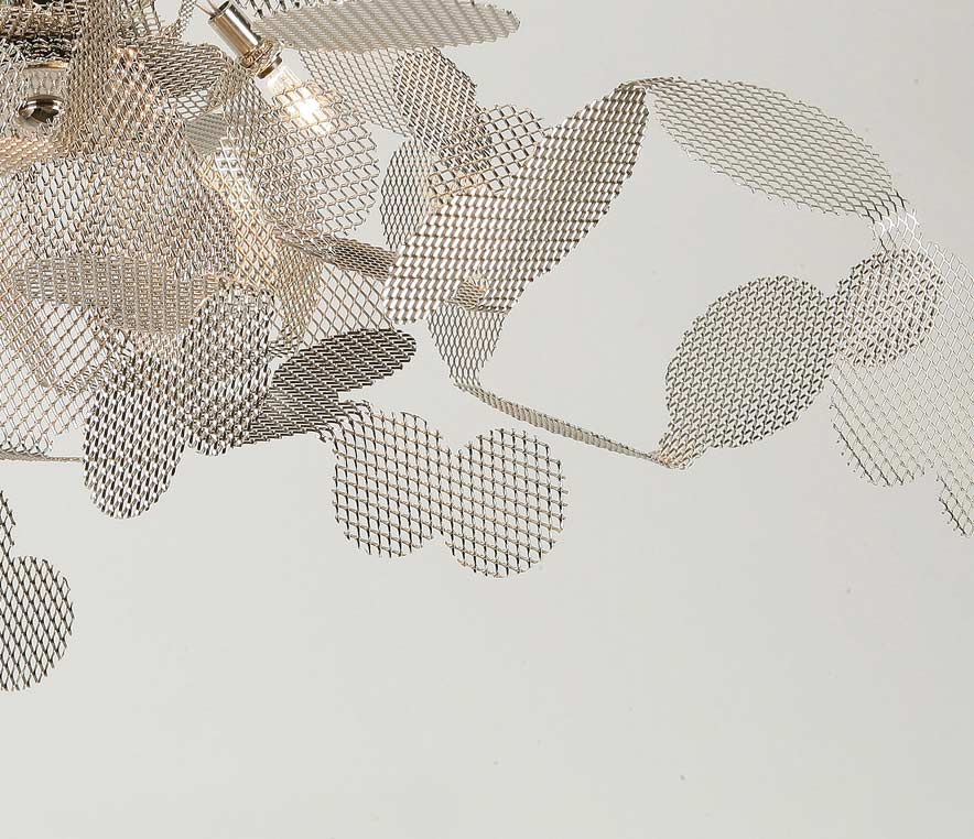 Avec sa structure suspendue composée de 4 lumières enveloppées de maille d'acier finition nickel, Unfocused affirme une présence contemporaine graphique. La maille métallique finition nickel structure l'ensemble et laisse passer la lumière à travers un motif régulier, générant des ombres fines. L'organisation volontairement asymétrique des éléments apporte une sensation de mouvement. La finition nickel accentue le caractère contemporain du modèle et s'intègre naturellement au-dessus d'une table ou dans un espace à vivre aux lignes architecturées.