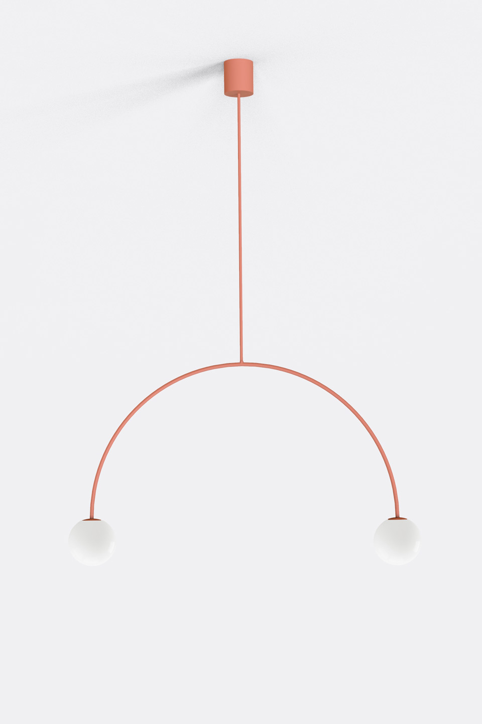 The large, 80 cm coral-shaped model from the Riga collection stands out thanks to its slender metal silhouette and two white glass ball diffusers. The large, U-shaped structure is fixed to a rod and cylindrical support, which enhances the vibrant coral colour. This generous model is ideal for living rooms or dining rooms, where it becomes the centrepiece while providing welcoming lighting.