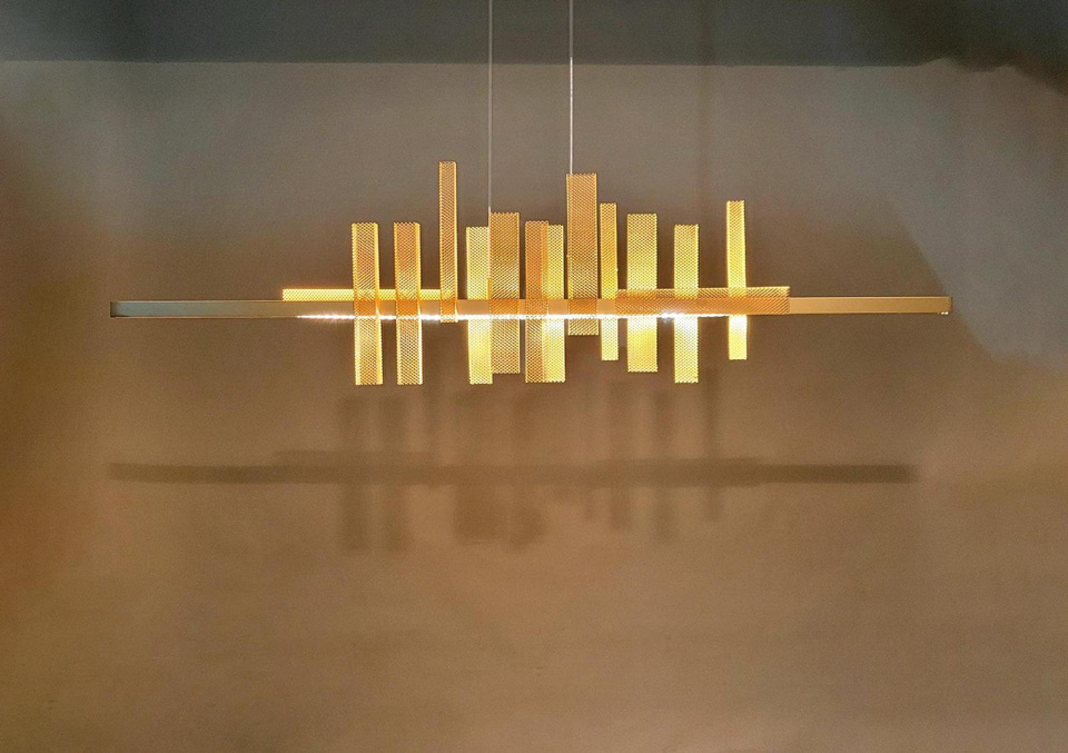 Large golden Skyline Metropolis pendant light. Myo.