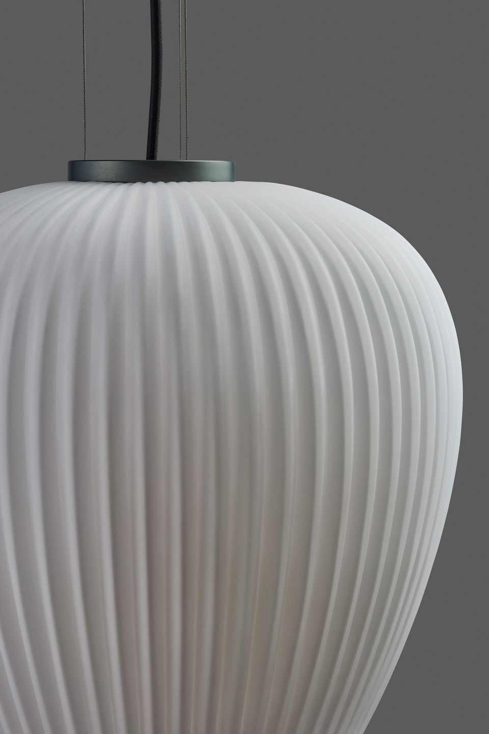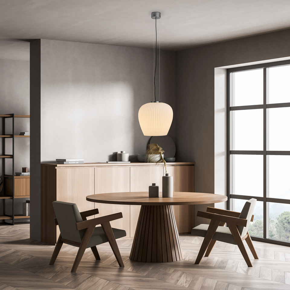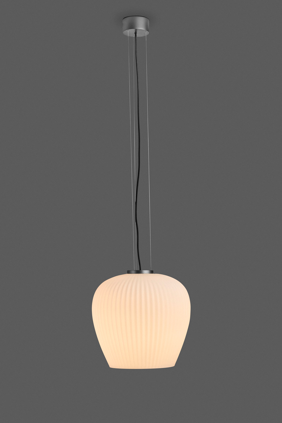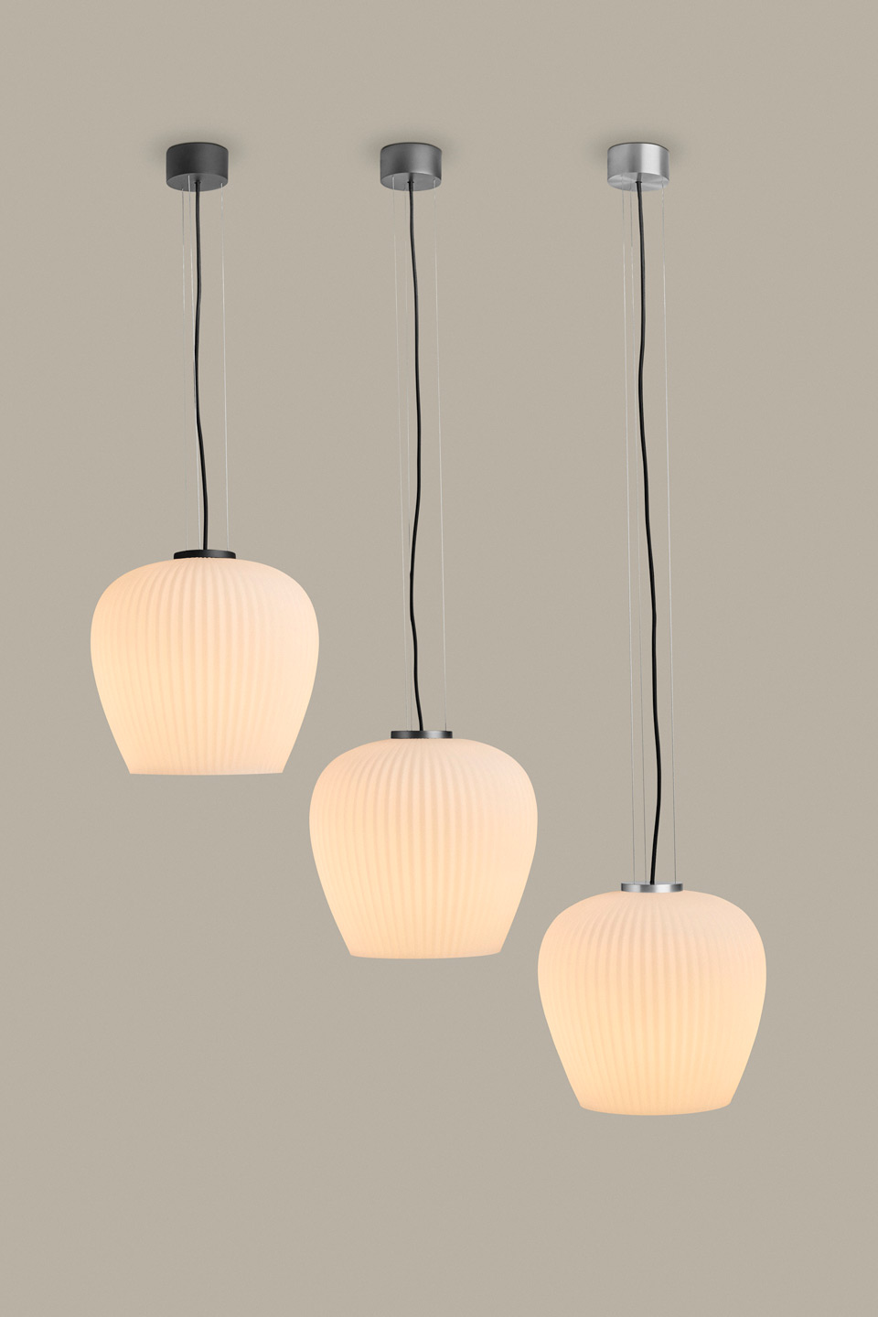 This is a design featuring the Liv pendant lamp, which has a curved, blown-glass shade and platinum-finish metal details. Reminiscent of a hot-air balloon, the model is equipped with a cylindrical ceiling mount to which the black power cable and three thin, almost invisible metal suspension cables are attached. The matt white opal pleated blown glass shade guarantees a warm, diffused light. The platinum-finish metal details contrast with the glass, lending the model a touch of elegance.