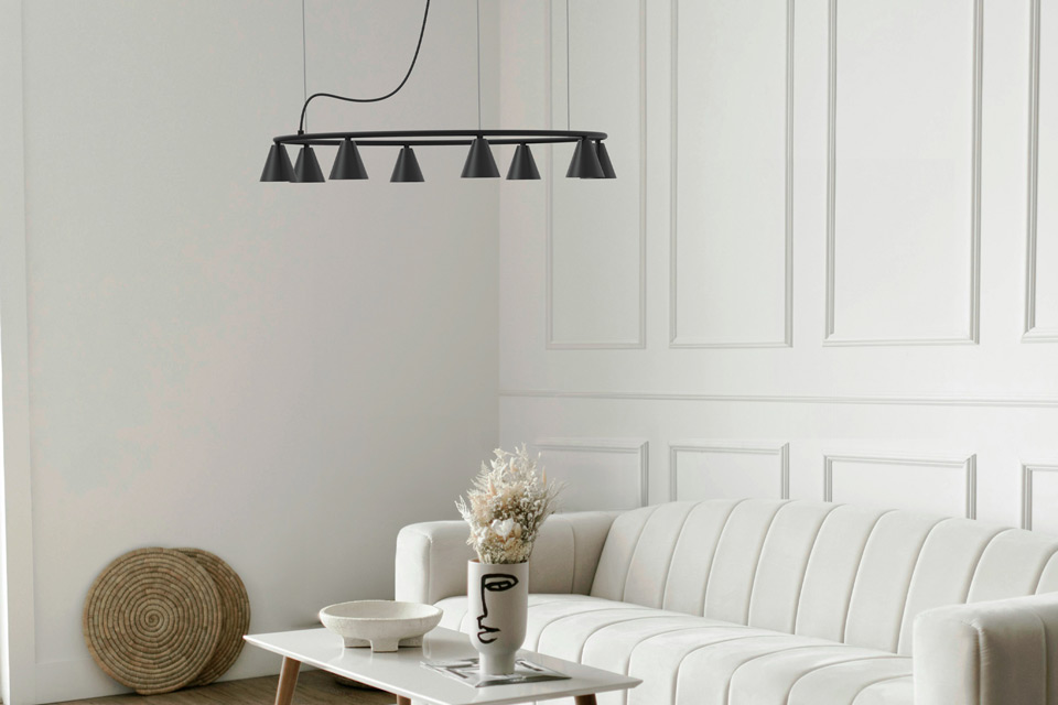 The contemporary Rimini pendant light is made of matt black metal and features a row of five conical shades for integrated linear LED lighting. Its horizontal structure is made of matt black metal and features a matching fabric cable and two fixing points: one on the round, black ceiling mount and two on small, silver-coloured metal hooks. Each cone houses an 8.5 W LED module offering a 45° beam, high luminous efficiency, and a high CRI for accurate colour rendering. This model is ideal for placement above a long dining table, a kitchen island, or in a row in a hallway. This model comes with a 5-year guarantee.