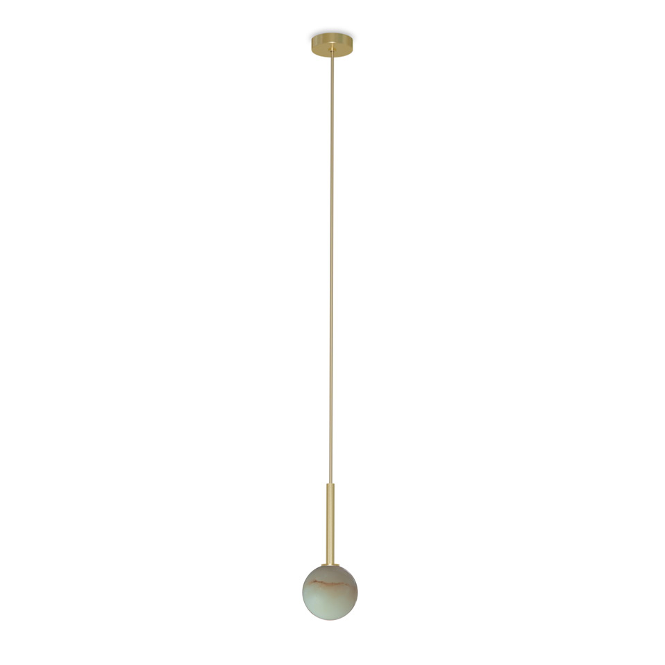 Thanks to its combination of a natural alabaster ball diffuser and a horizontal gold-plated metal reflector disc, the Royal pendant light stands out with its contemporary graphic and minimalist design. Consisting of a round ceiling mount, a gold-plated fabric-covered cable and an alabaster ball, each component features the unique veining characteristic of natural stone. This pendant light can be installed alone as a subtle light source, or in a series to define a space - for example, above an open-plan kitchen or to illuminate a large dining table.