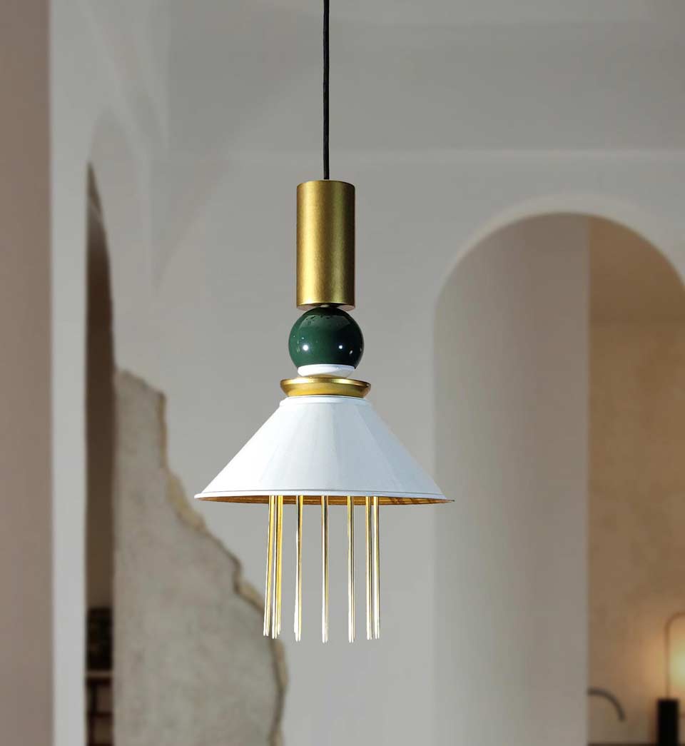 La suspension Bohême petit modèle est dotée d'une sphère verte, d'un cône blanc et d'un rideau de tiges métalliques dorées aux accents Art Déco. La partie supérieure associe un cylindre en laiton satiné à une sphère en acier laqué vert, surmontant un abat-jour conique et évasé blanc en métal. Sous cette base, un rideau de fines tiges métalliques en laiton brillant filtre la lumière. L'éclairage LED intégré est placé au cœur du luminaire, diffusant une lumière dirigée vers le bas. Le contraste des couleurs et le travail du laiton confèrent à cette suspension un caractère décoratif, adapté à un éclairage ponctuel au-dessus d'une table, d'un chevet ou en composition multiple.