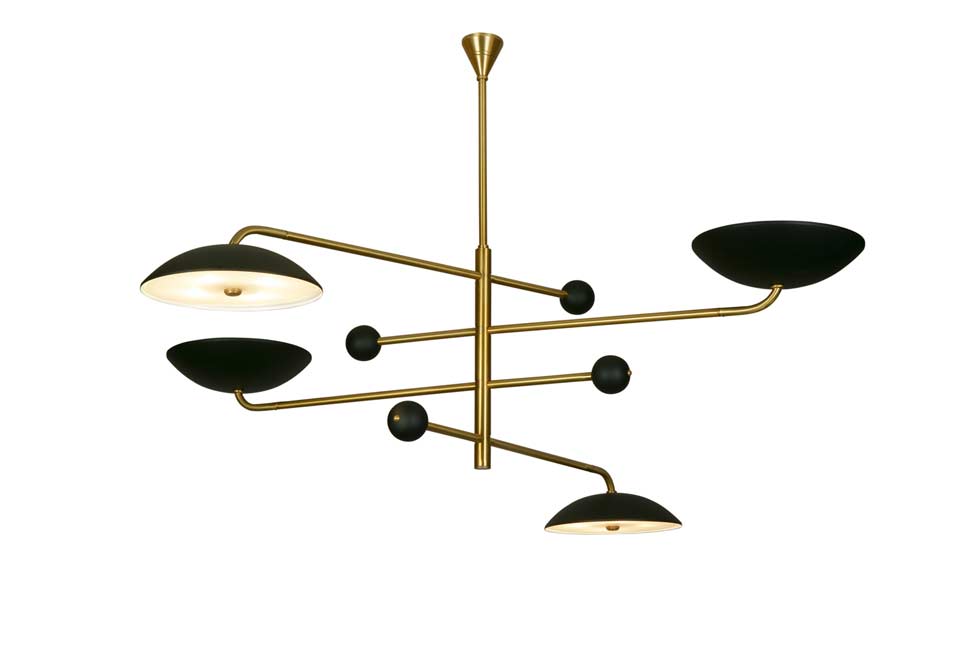 Twirl est une suspension 4 lumières à la structure en laiton doré et abat-jours noirs orientables, inspirée du design des années 50. La composition repose sur un axe central autour duquel s'articulent quatre bras disposés comme un mobile, chacun terminé par un abat-jour équipé d'un diffuseur blanc qui masque 4 ampoules. L'association du laiton et du noir mat souligne la géométrie du dessin tout en affirmant une élégance graphique intemporelle.