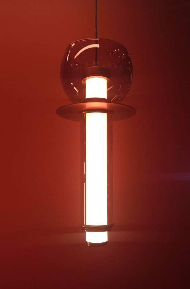 <br/>Abacus triple pendant in white glass and satin brass. Terzani. Unfocused triple pendant in black steel mesh. Myo. Ephelia linear LED illuminated sculpture pendant light. Myo. Puppet suspension 5 glass and gold spheres. Vistosi. Puppet pendant lamp 5 spheres and black nickel. Vistosi.