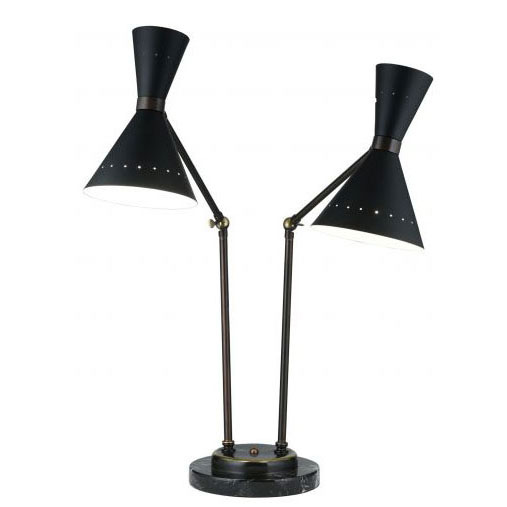 This elegant black table lamp from the Diva collection has articulated arms and is recognisable by the hourglass shape of its black metal and brushed bronze diffusers. It has a black marble base. The two asymmetrical, hourglass-shaped diffusers appear to be made from a single sheet of metal rolled up to form this conical shape and perforated with a row of tiny holes around the entire circumference. They are painted black with a white interior to reflect light more intensely. The two legs each have small ball joints at two points, allowing Diva to be used in a variety of ways. It has a black finish with a touch of gold and the base comprises a metal ring screwed onto a veined black marble disc for great stability.