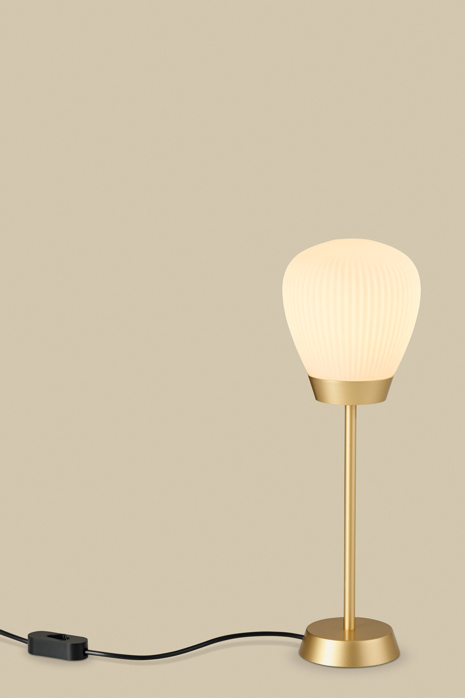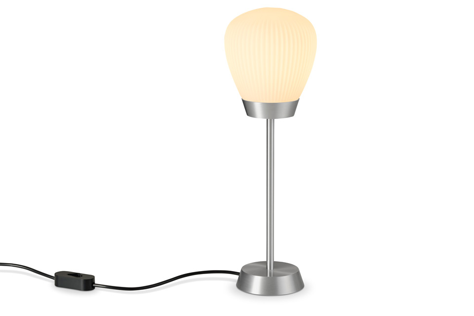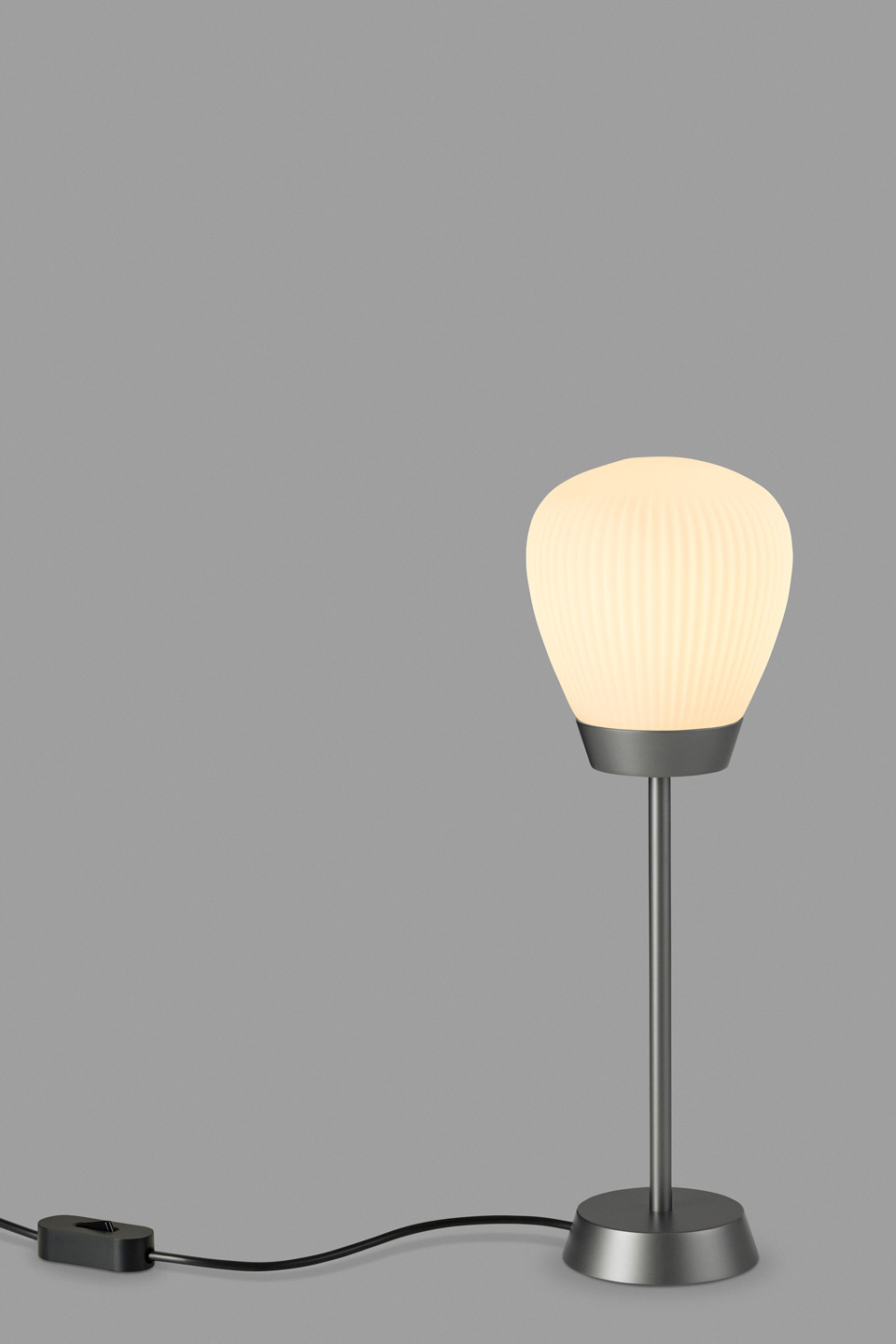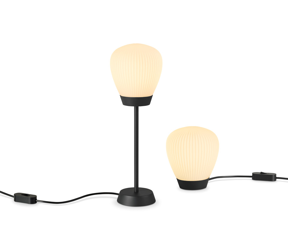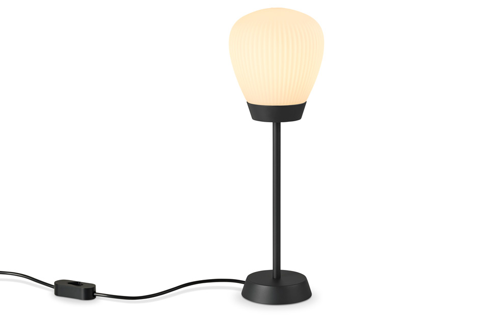 Featuring a round base and a straight stem in matt black anodised aluminium, the Plissée table lamp exudes retro charm. It is topped with a hot-air balloon-shaped diffuser made of matt white pleated blown glass. When the lamp is switched on, this glasswork creates a subtle play of shadows. The black power cable with an elegant manual switch makes the lamp easy to use on a desk or bedside table.