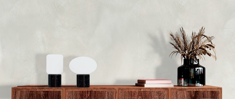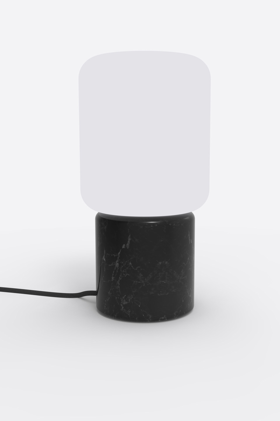 The small, minimalist Remi table lamp is shaped like a black marble lantern and has a white opal glass cylinder diffuser. The Remi consists of a cylindrical black marble base and a wider cylindrical diffuser made of white opal glass. The combination of these materials creates a refined contrast, complemented by a subtle black textile cable. Its compact size means it can be placed next to a bookcase or in a corner of the living room for night-time reading, or used as a bedside lamp.