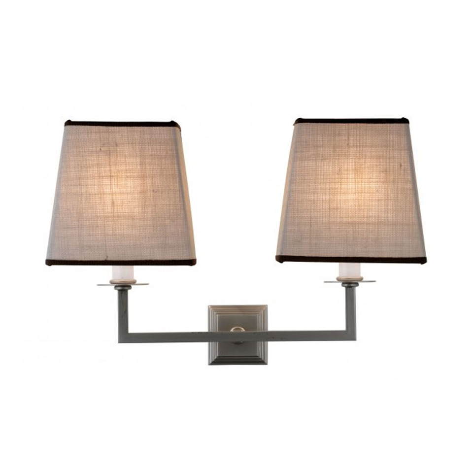 The charming Alisea double wall light features a classic design, combining a satin nickel metal frame with jute lampshades. Its square wall bracket features an extending metal arm with two light sources on either side. Each lamp consists of a thin metal disc topped with a white bobbin and half a lampshade. These are slightly conical in shape, made of jute fabric and elegantly edged in black around their openings. The contrast between the satin nickel finish and the natural texture of the jute gives this model a unique charm, combining sophistication and authenticity.