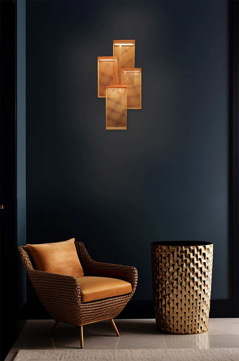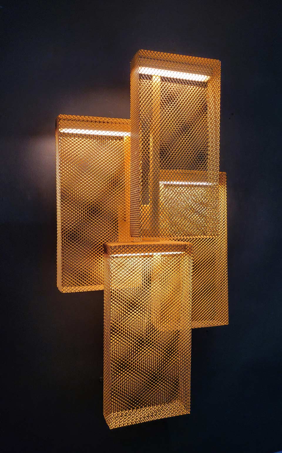 Applique murale à l'allure monumentale, Babylon propose des panneaux verticaux en maille d'acier doré se superposant comme les strates d'une architecture ancienne, laissant apparaître un éclairage LED intégré qui se diffuse à travers la matière. La trame métallique filtre la lumière et crée un halo chaud et texturé. Pensée comme une sculpture lumineuse, l'applique Babylon apporte une présence forte, idéale pour habiller un mur.