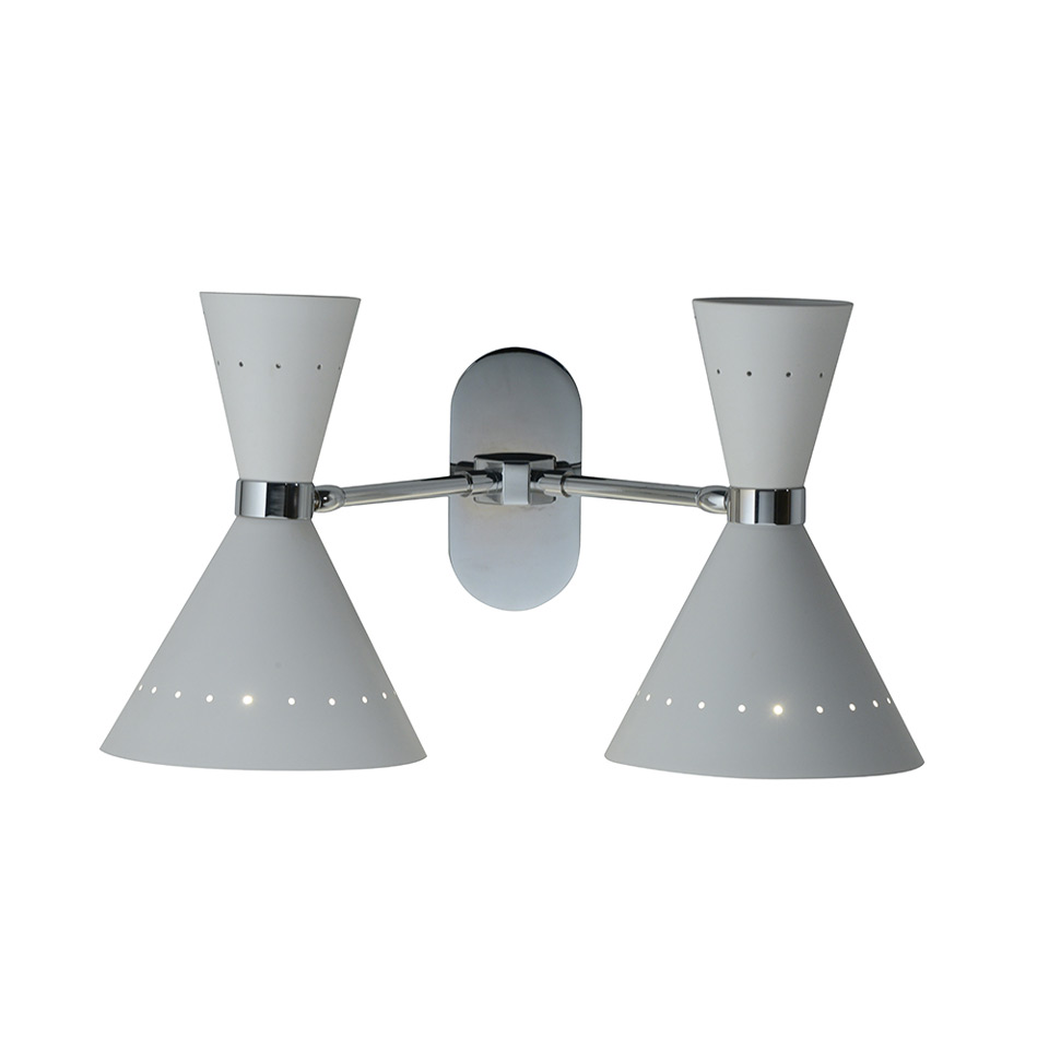 This attractive double wall lamp features two conical, diabolo-shaped shades in white metal and chrome, and is part of the Diva collection. The diffusers are adjustable. Designed by Michele Bonan, it features an oval wall bracket with two fixed arms. The diffusers at the ends of these arms are made of white metal sheet rolled into an asymmetrical hourglass shape. Pierced with a row of tiny holes around the entire circumference, the diffusers are adjustable.This wall lamp is part of a collection designed by Michele Bonan for prestigious projects.