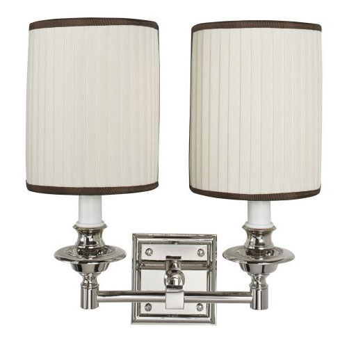 The Juliette double wall light combines elegance with a classic design. Here it is in a chrome metal version with ivory pleated fabric shades that are edged with black piping at the top and bottom. The wall bracket is a vertical square metal frame that serves as the base for two light sources arranged on either side of a horizontal arm. Each light features traditional chandelier elements, including a silver basin and bobbin topped with an imitation white candle and a white pleated fabric cylindrical lampshade edged with black. The fabric lampshade diffuses a warm light, delicately reflecting its glow onto the metal structure. This wall light is part of the exclusive collection designed by Michele Bönan to enhance his most prestigious projects.