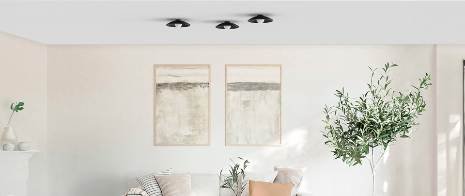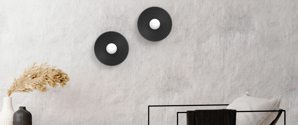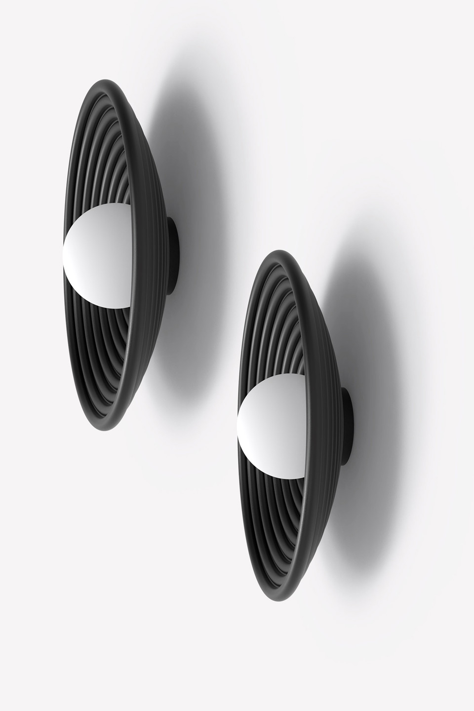 The Randa wall light has a distinctive design comprising a large black aluminium diffuser in the shape of a striated parabola with a white opal glass ball at its centre. This combination creates a striking contrast. The striated surface of the parabola accentuates the relief effects, giving the model a strong graphic presence. Thanks to the white opal glass ball, Randa diffuses uniform light and can be installed on its own or as part of a wall or ceiling composition, as can be seen in the additional photos.