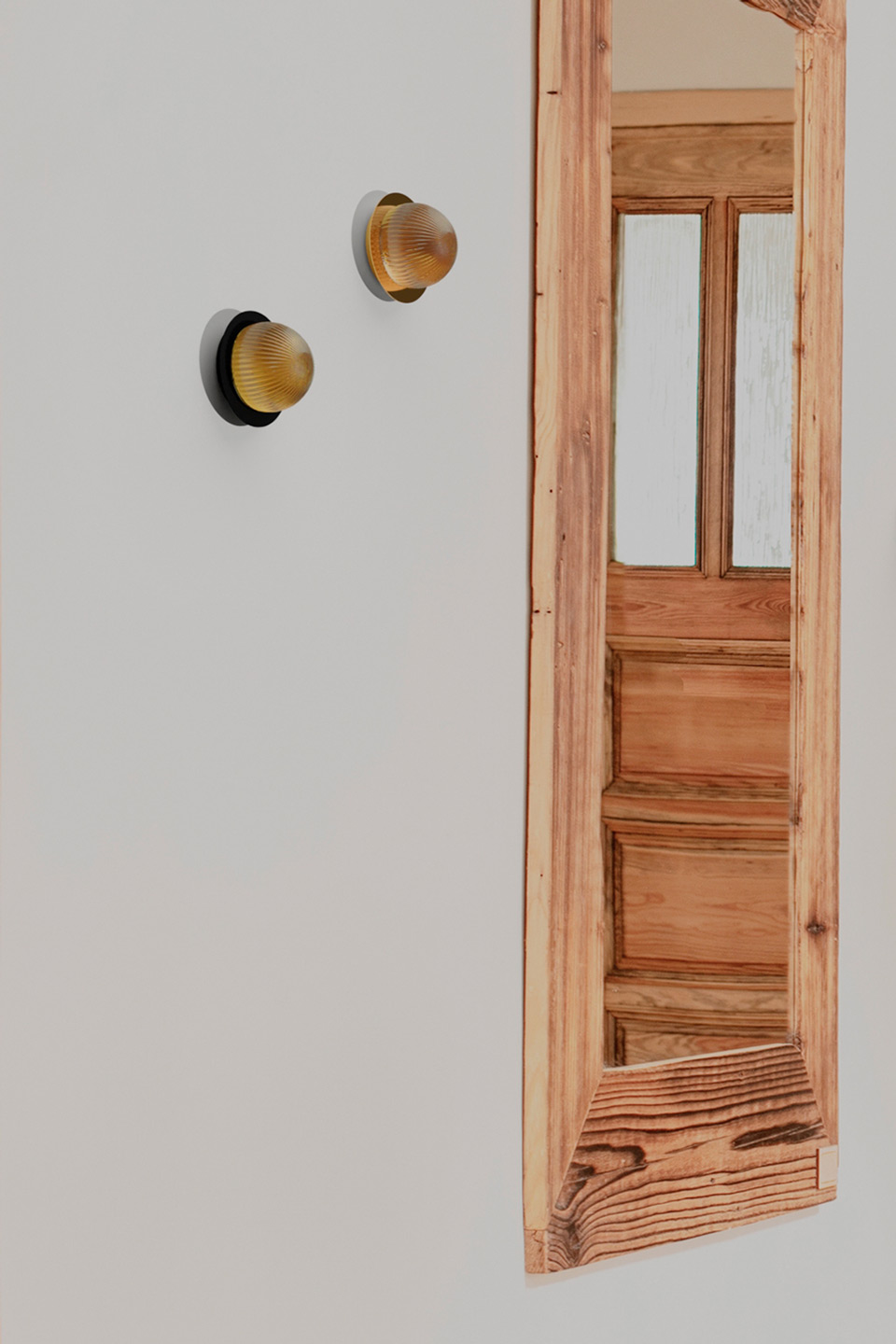 The Roi Disque wall light features a black metal wall bracket and a transparent smoked glass dome. A reflective disc enhances the design, amplifying the light. The combination of the dark metal and the reflections from the fluted glass creates subtle lighting that combines depth and transparency. This versatile model can be used on its own or in a series to highlight a corridor or frame a mirror. As a wall or ceiling light, it emits an elegant glow to create a cosy atmosphere, as can be seen in the additional photos.
