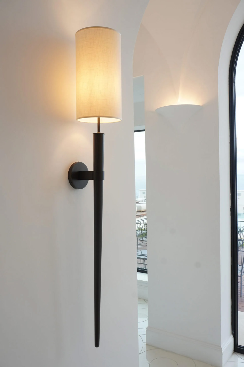 This is the very large Lucy torch wall light, which is made of bronze metal and has a cylindrical fabric shade. The model features a round wall bracket and a short arm supporting a narrow black metal cone along its entire length. The body of the wall light is slightly angled away from the wall. The lampshade is a tall cream fabric cylinder that provides soft lighting. As you can see in the additional photos, this model is ideal for illuminating large rooms with pillars or arches.